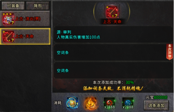 失败规则:添加词条有失败概率,失败不消耗精魄,但元宝及其他材料正常消耗;添加词条均为普通品质,需洗练提升品质。