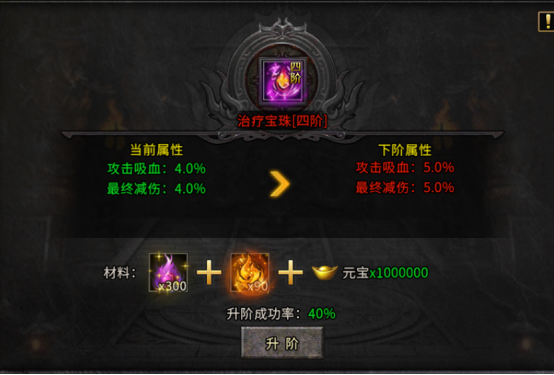 升阶效果:每升1阶增加1%攻击吸血和1%怪物免伤,最高可升至10阶。
