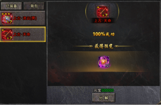 适用装备:普通、上古、起源、鸿蒙、天启成品剑甲,珍稀装备分解前请谨慎确认。