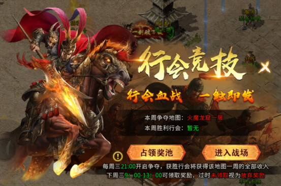 奖励规则:获胜行会获得本周争夺地图的门票收取权,门票费归入总奖池;奖励于下一场活动当天9:00-13:00领取,逾期作废。分配比例为:会长20%、副会长10%、成员按人数均分60%。