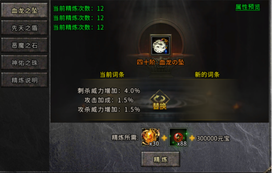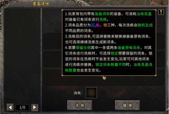 词条品质:分为蓝、紫、橙三档,每次洗练随机生成新品质词条,可选择替换原有词条或继续洗练。