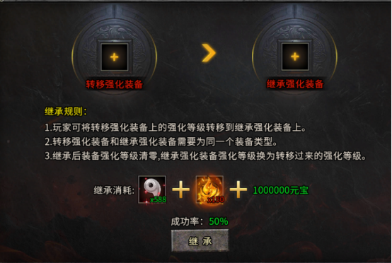 继承规则:同类型装备可转移强化等级,继承后原装备强化等级清零,目标装备获得对应等级。