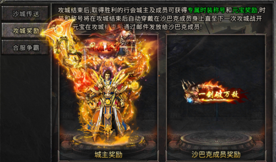 参与规则:行会会长缴纳报名费后,成员方可进入沙巴克皇宫争夺;获胜行会城主及成员可获得专属时装、称号及元宝奖励,彰显无上荣耀。