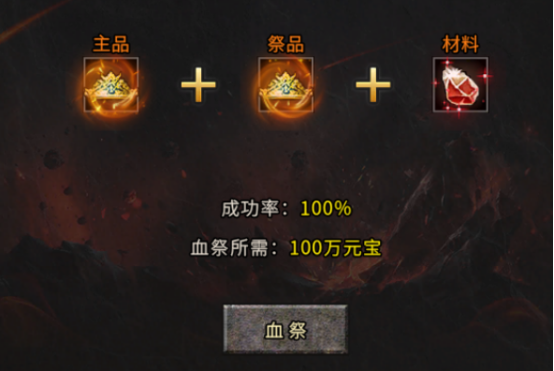 适用于斗笠、盾牌、特戒、宝珠,消耗对应祭品装备(与主装备同类型)和血祭之心可进行血祭,属性不满意可重复血祭覆盖: