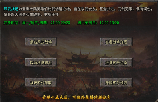 开启时间:周一/周三/周四21:00-22:20,周六至周日12:00-13:20;开服15天后开启跨服风云战场。