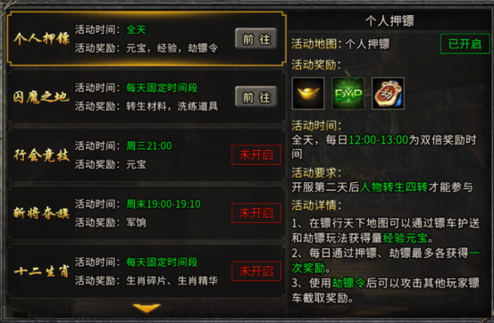 活动规则:全天可参与,每日12:00-13:00为双倍奖励时间;在镖行天下地图通过护镖、劫镖获取经验和元宝,每日护镖、劫镖各限获1次奖励;使用劫镖令可攻击其他玩家镖车截取奖励。