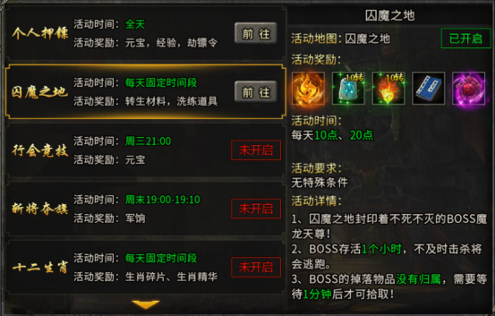 玩法详情:地图内可正常PK抢夺怪物归属;怪物主要掉落生肖碎片、生肖精华(生肖升级核心道具);每次活动最多刷新1只BOSS,其余小怪死亡后10分钟刷新。
